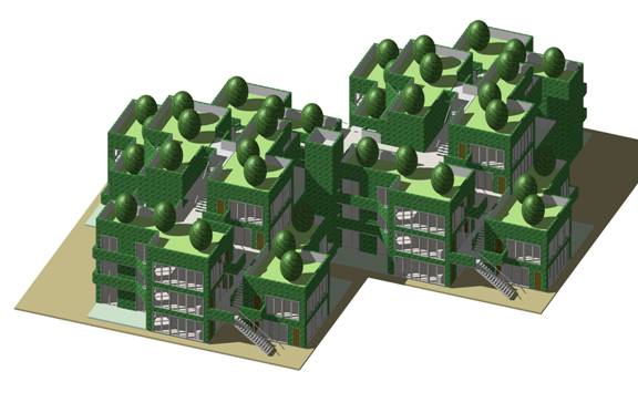 島の内部はは巨大な吹き抜けで、どこに照明器具があるのかよくわからなかったが、不思議と明るかった。見上げるとトップライトになった池の裏側が見える。これ以外にも通路や階段にはガラスブロックが埋まっている。よく見るといろんなところから太陽光線が入るようになっているようだ。木漏れ日のような光に満たされた巨大な内部空間の広がりはなんとなく空洞地球説を思わせる。はるかな下を見下ろすと公園や広場が多いものの、意外に普通の建築が建ち並んだ普通の町並みに見える部分も多い。学校らしきものも見える。